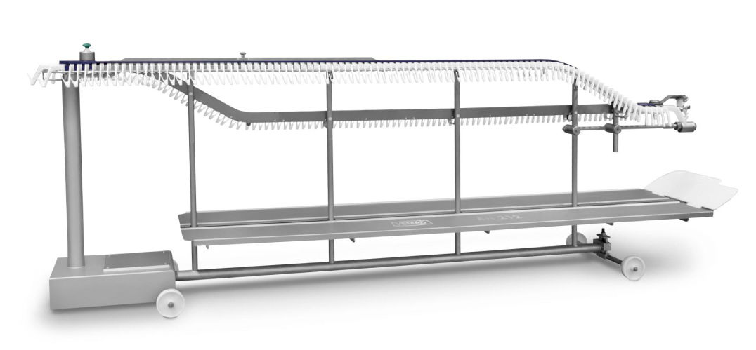 A pendurador AH212 é um equipamento para pendurar automaticamente diferentes tipos de salsichas e linguiças. Graças ao espaçamento facilmente adaptável, o equipamento pode ser ajustado para otimizar o posicionamento na vara e ideal aproveitamento do espaço na câmara de defumação e cura. A AH212 oferece duas alturas diferentes: a primeira eleva as salsichas para facilitar sua fi nalização manual, a segunda facilita a colocação da vara e remoção.